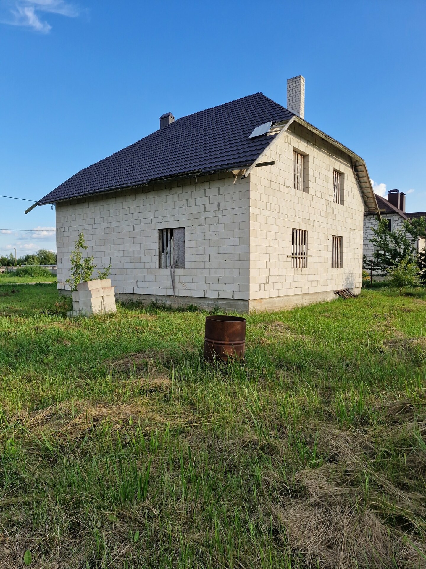 Двухэтажный дом построен из блоков, крыша- металлочерепица.