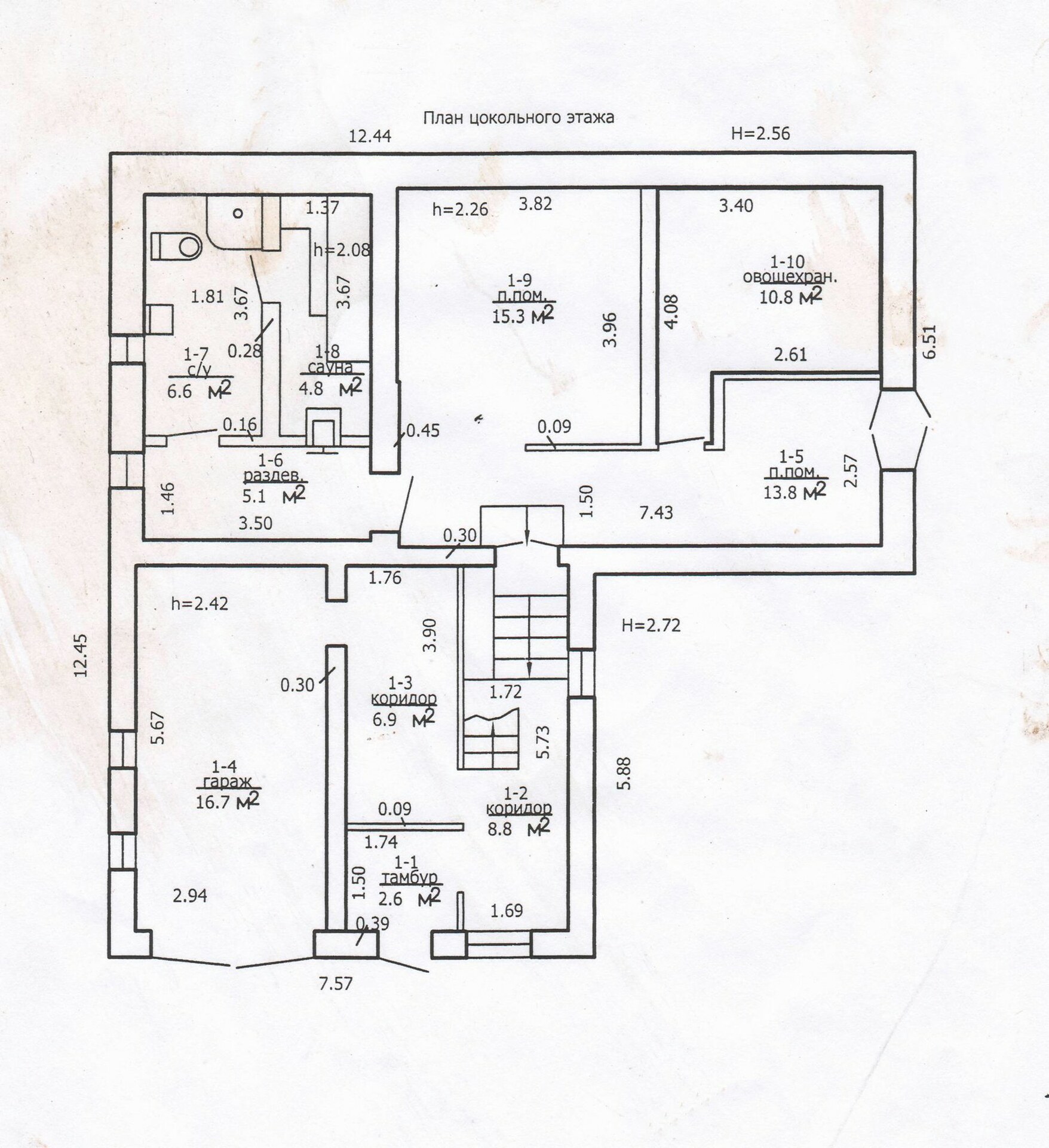 - 1 уровень – цоколь. Находятся: гараж, овощехранилище, сауна, сан.узел и котельная.