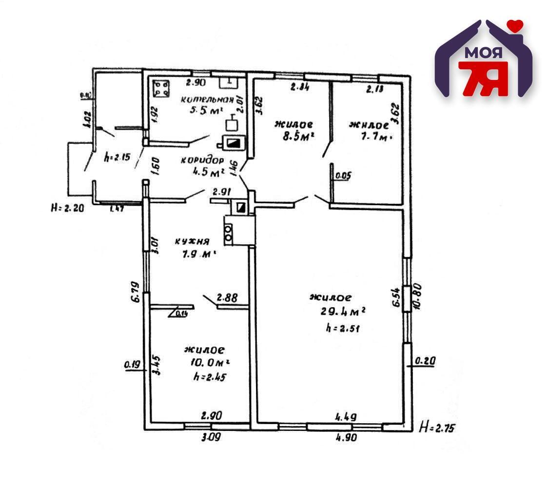 - Одноэтажный бревенчатый дом общей площадью 73,5 м2, жилая площадь составляет 55,6 м2, кухня - 7,9 м2