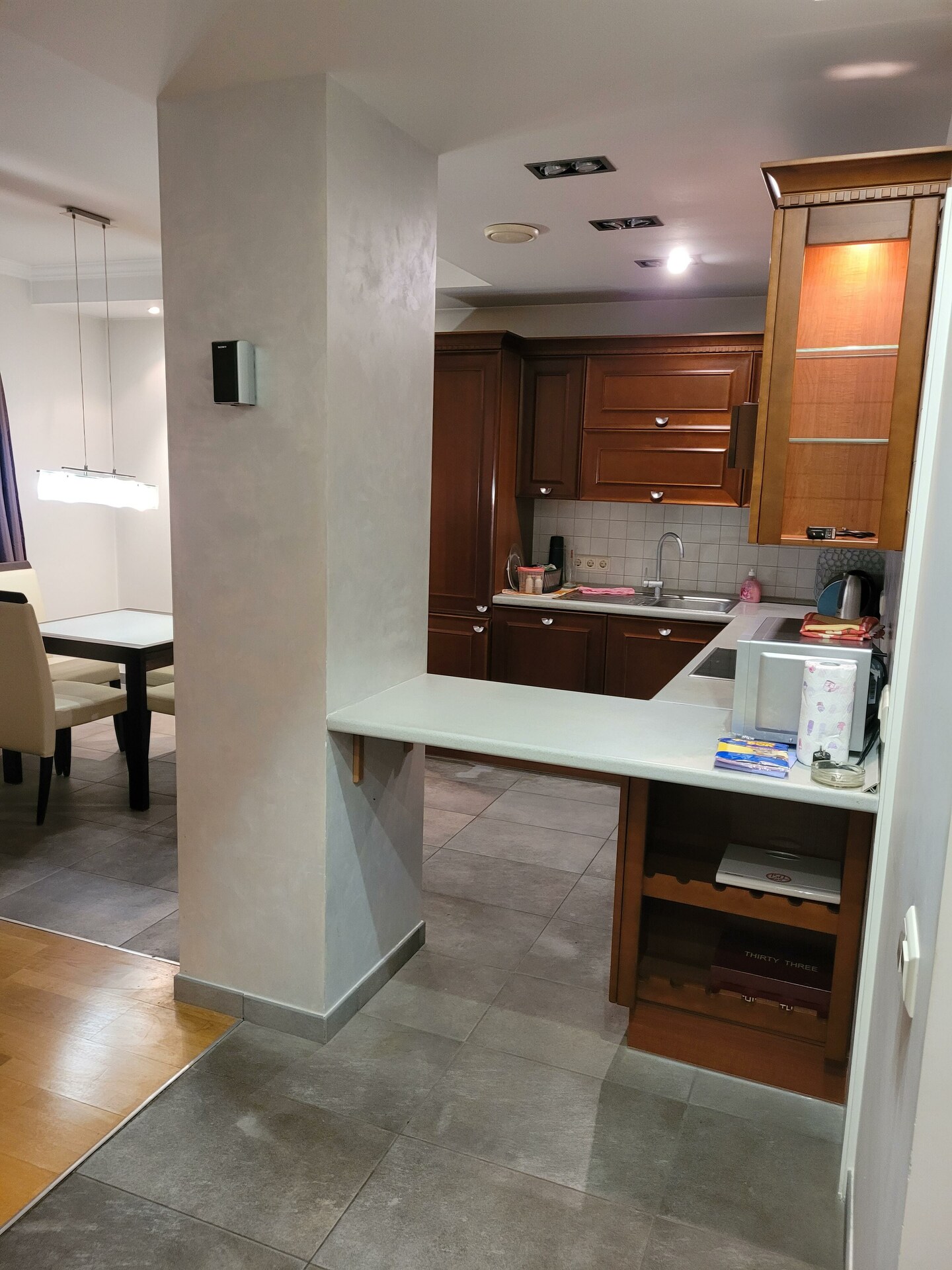На этаже всего три квартиры. В доме два лифта: пассажирский и грузовой. Дом обслуживает товарищество собственников. Есть консьерж. По периметру и в парадной части подъезда установлено видеонаблюдение. Своя парковка под шлагбаумом.