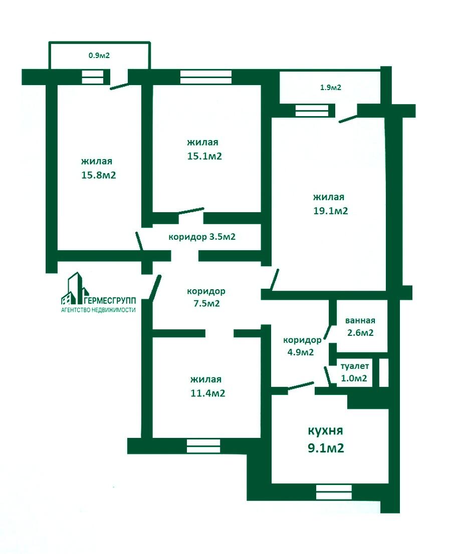 Общая площадь по СНБ – 92,8 м2, жилая – 61,4 м2, кухня – 9,1 м2.