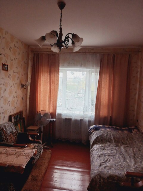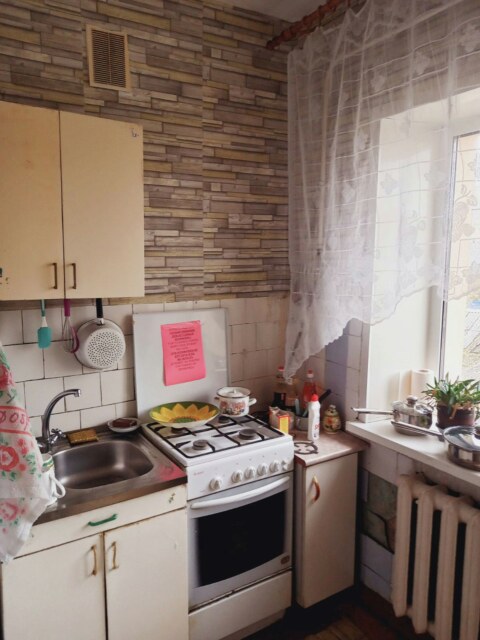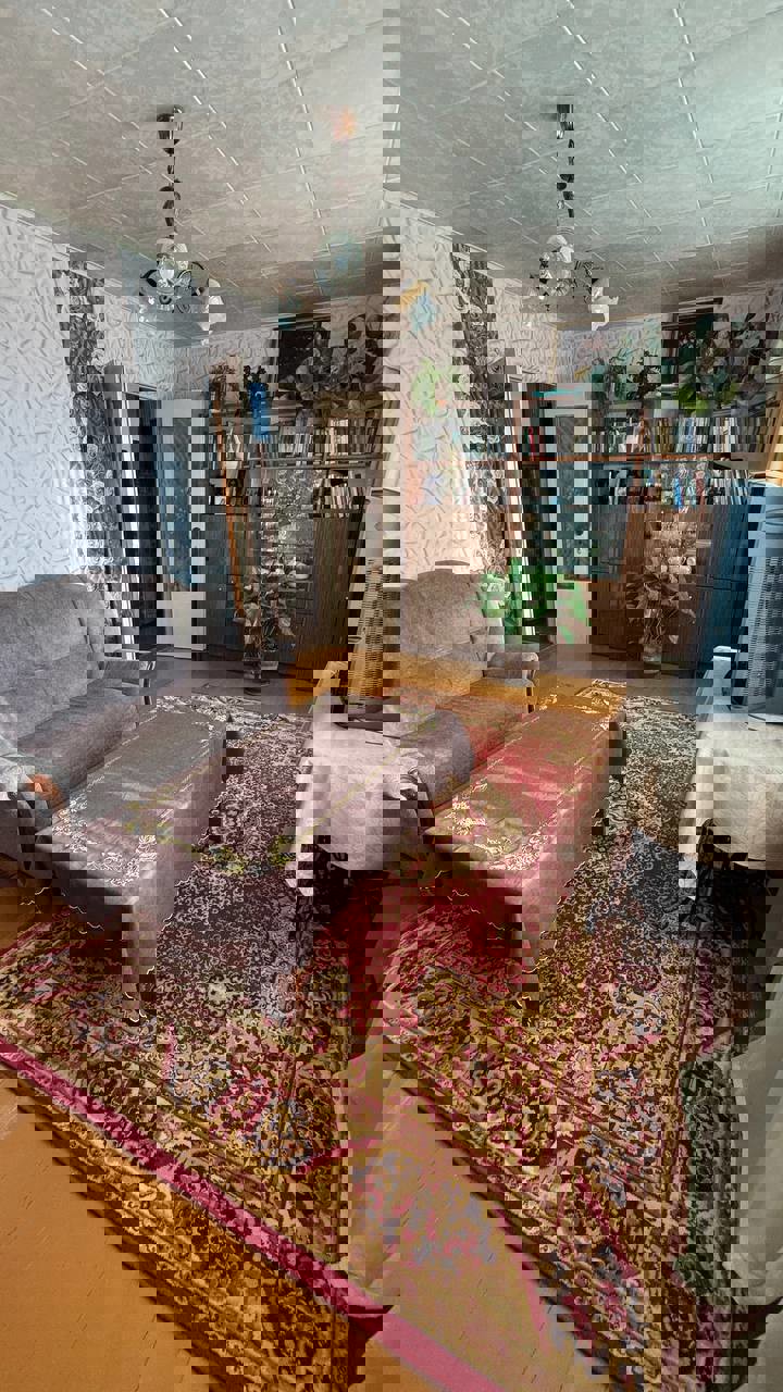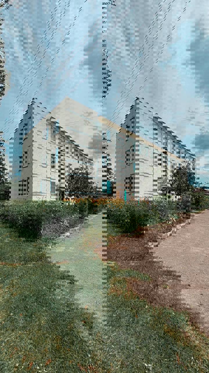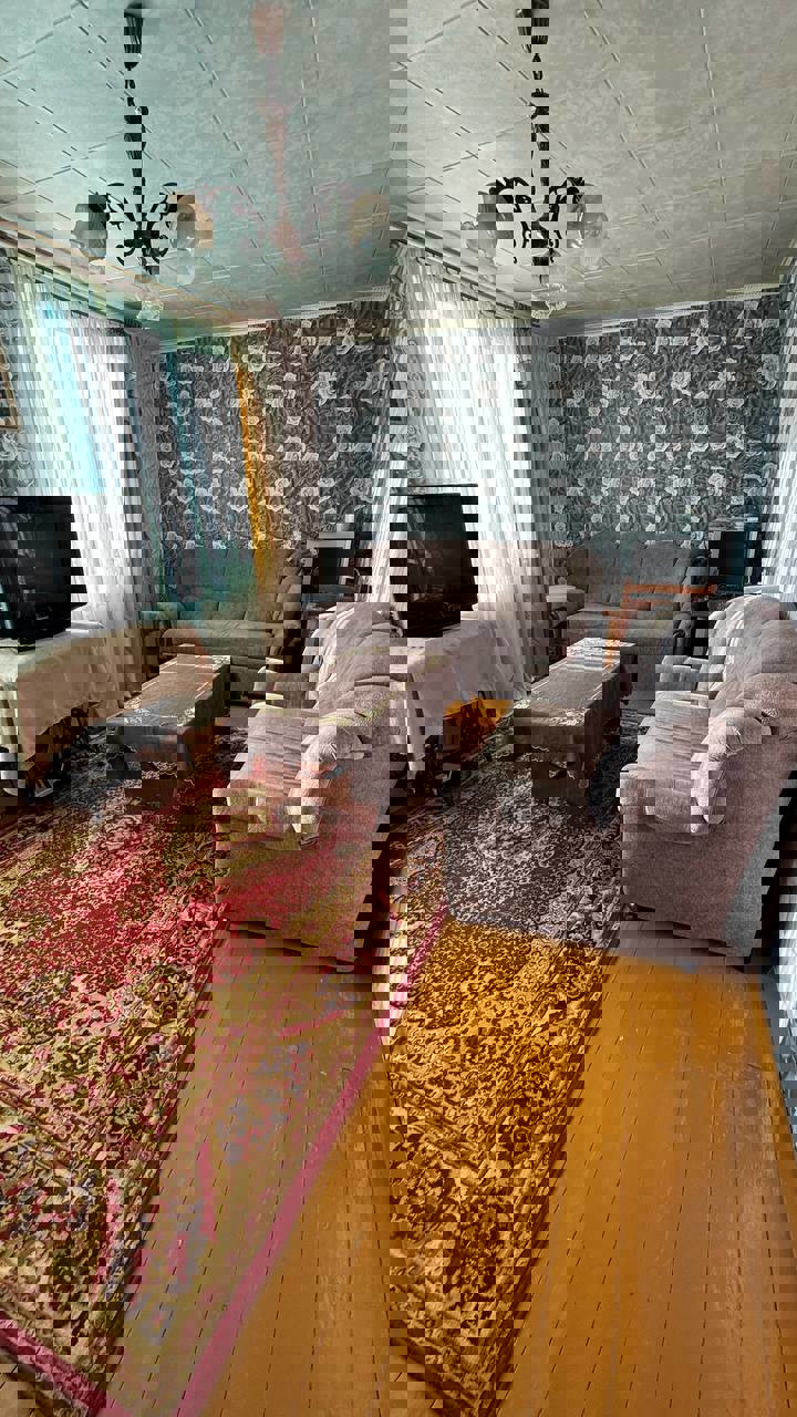 Общая площадь 64 м2, кухня 9 м2. Квартира расположена на первом этаже, трех этажного дома. Возле дома есть парковочные места.