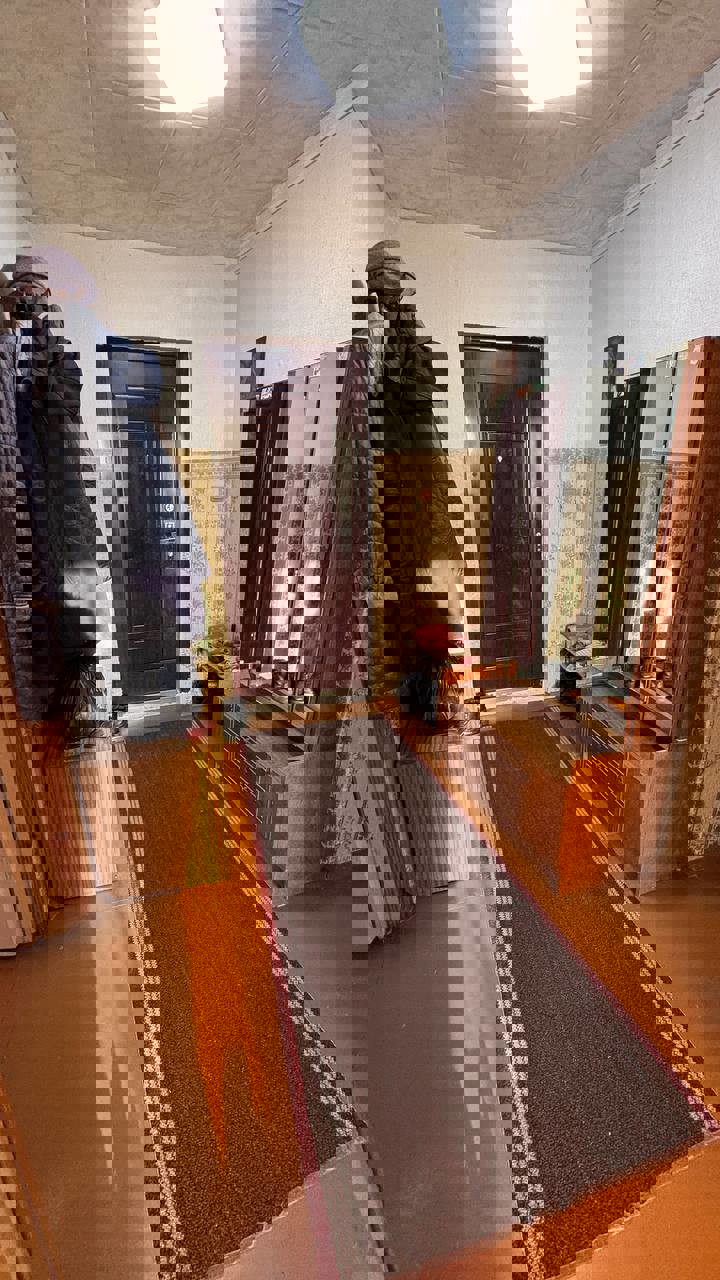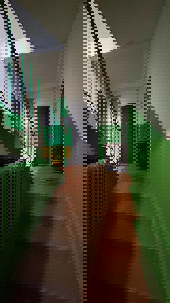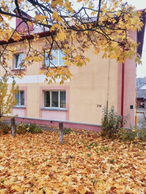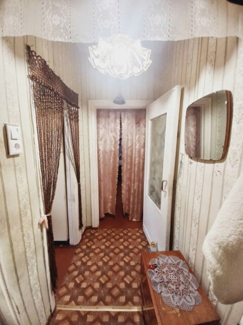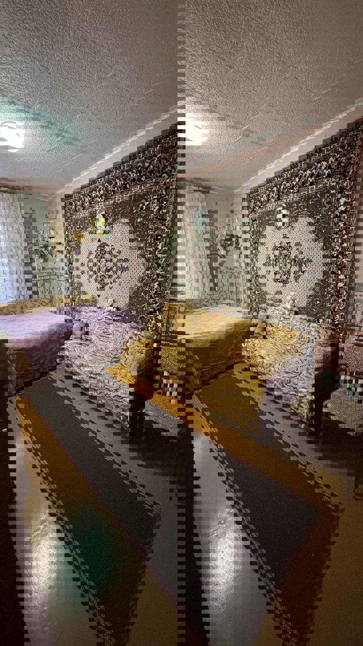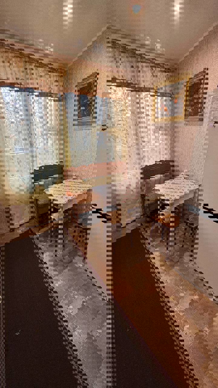 Общая площадь 64 м2, кухня 9 м2. Квартира расположена на первом этаже, трех этажного дома. Возле дома есть парковочные места.