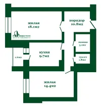 Общая площадь 59.5 м2, жилая 32.5 м2, кухня 9.7 м2. Высота потолков 2,5 м.
