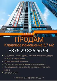 Продам кладовое помещение в доме "Гавайи" ЖК Минск-Мир. Общая площадь -5,7 м2, сделан ремонт, на полу плитка, стены-штукатурка, укомплектовано стеллажами, заменена входная дверь. Помещение теплое, трубы и коммуникации не проходят. Отопление. Освещение. Туалет и горячая вода на 1 этаже в доме.
