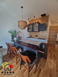 Гостиная комната совмещена с кухонной зоной. Кухня выполнена из качественных материалов, а техника встроена: холодильник, варочная индукционная поверхность, вытяжка, посудомоечная машина. В зоне гостиной - большой телевизор, удобно расположился раскладной диван. По всей зоне кухни-гостиной размещены различные сценарии освещения.