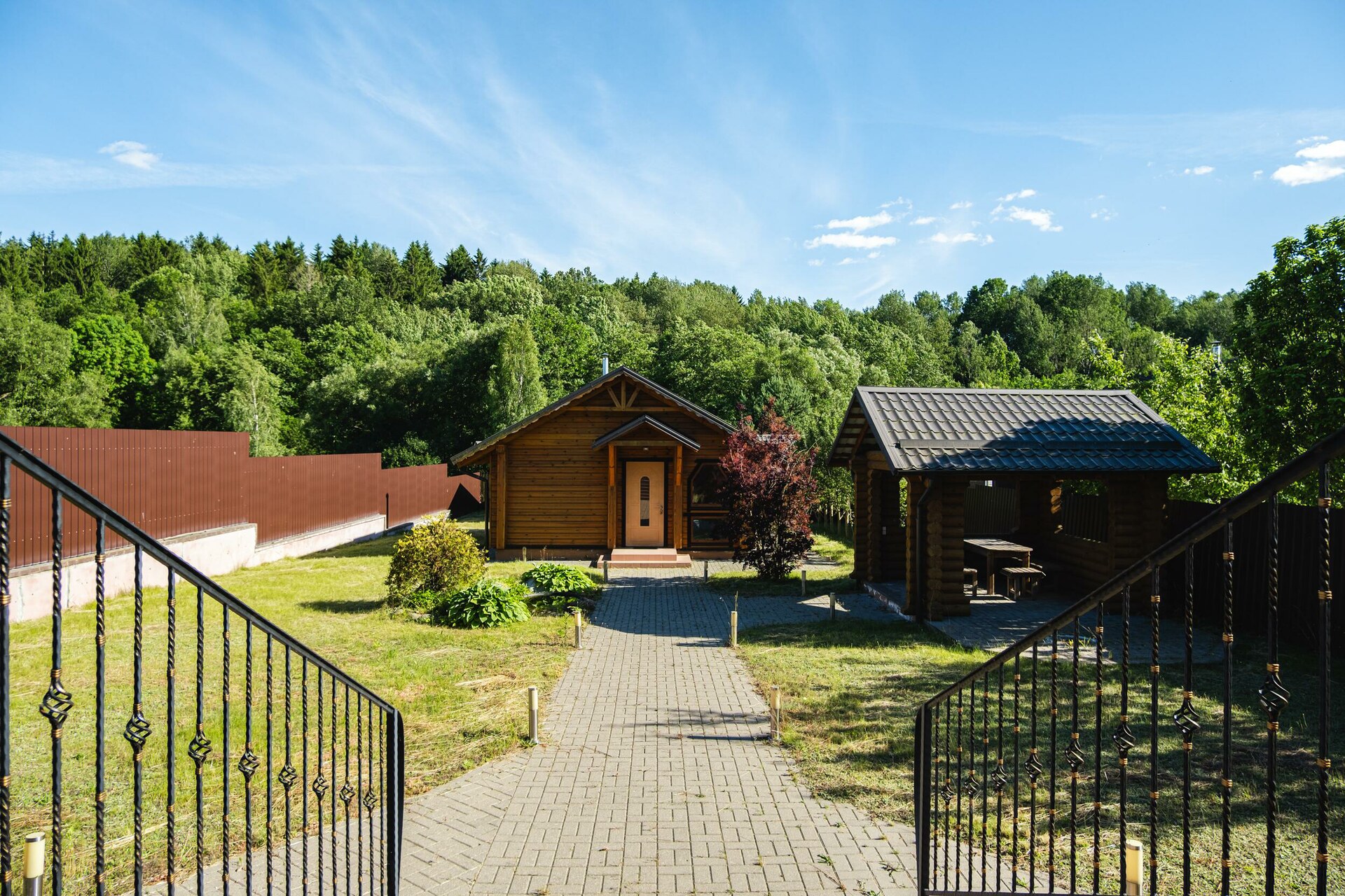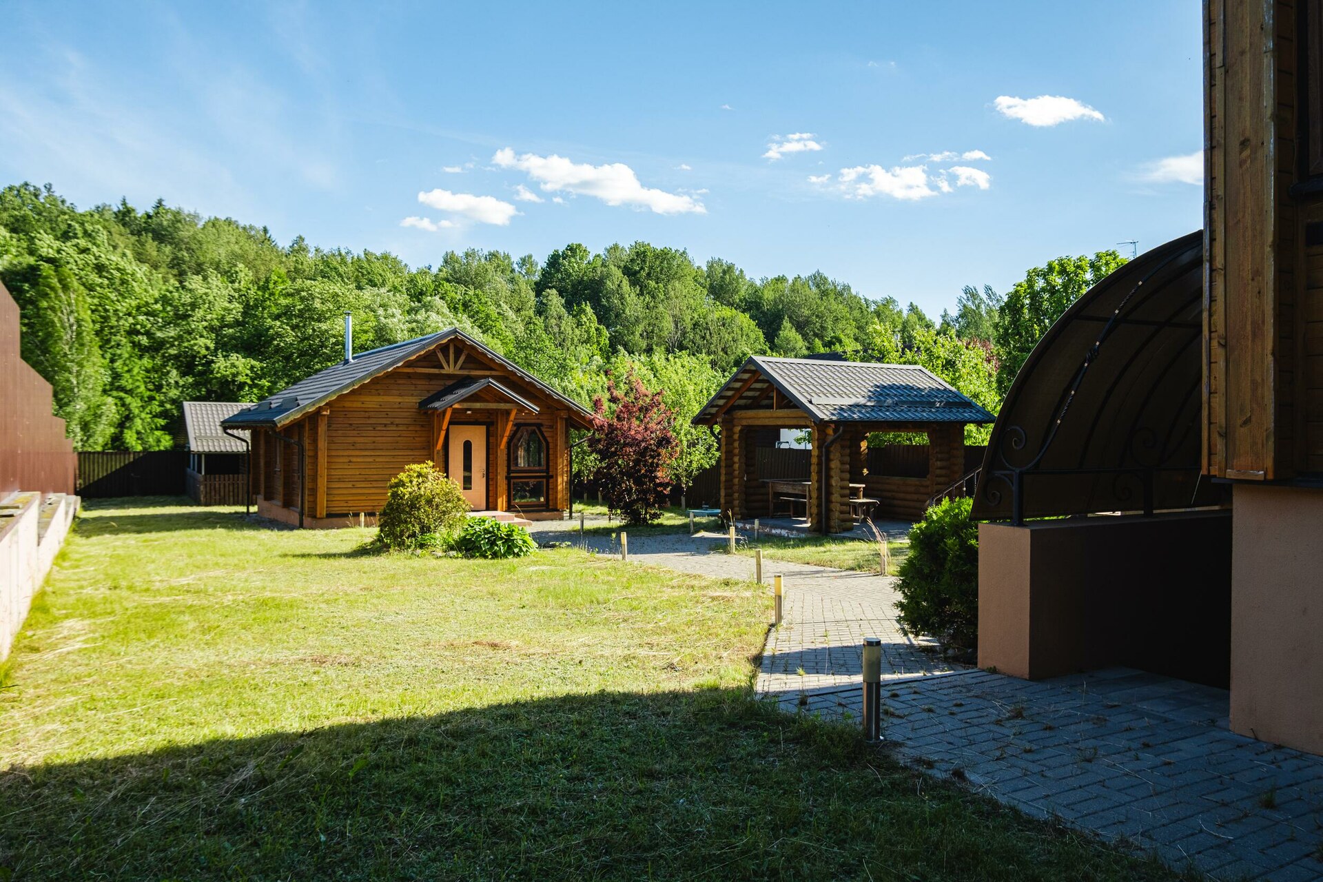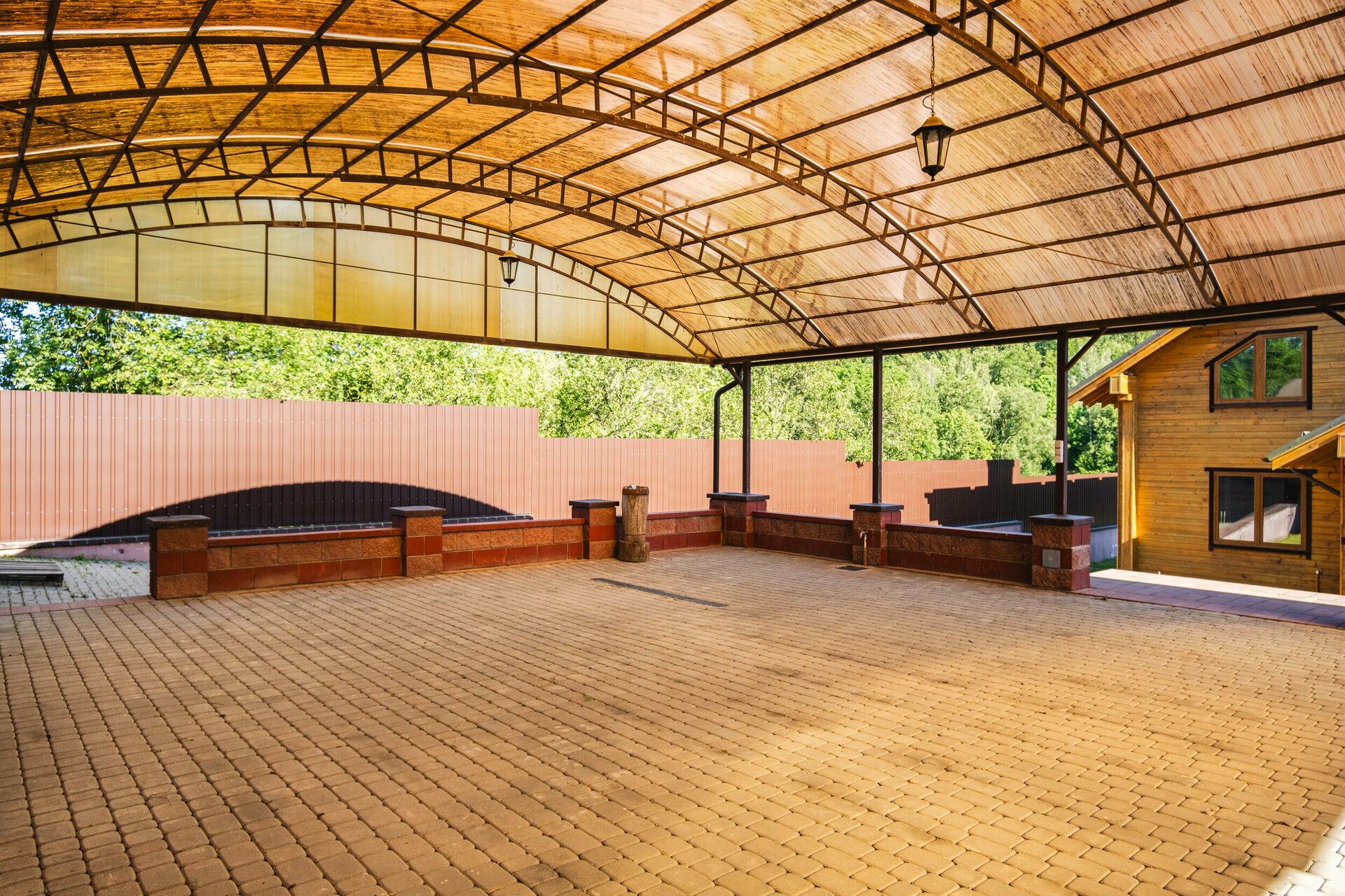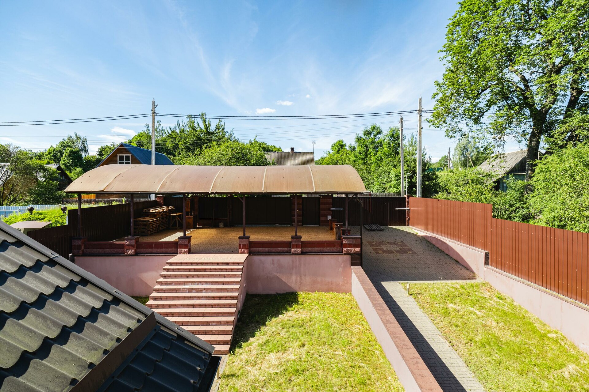 Мощение плиткой площадки перед домом. Парковочная площадка с навесом. Двухсекционные откатные ворота на электроприводе. Ливневый дренаж.