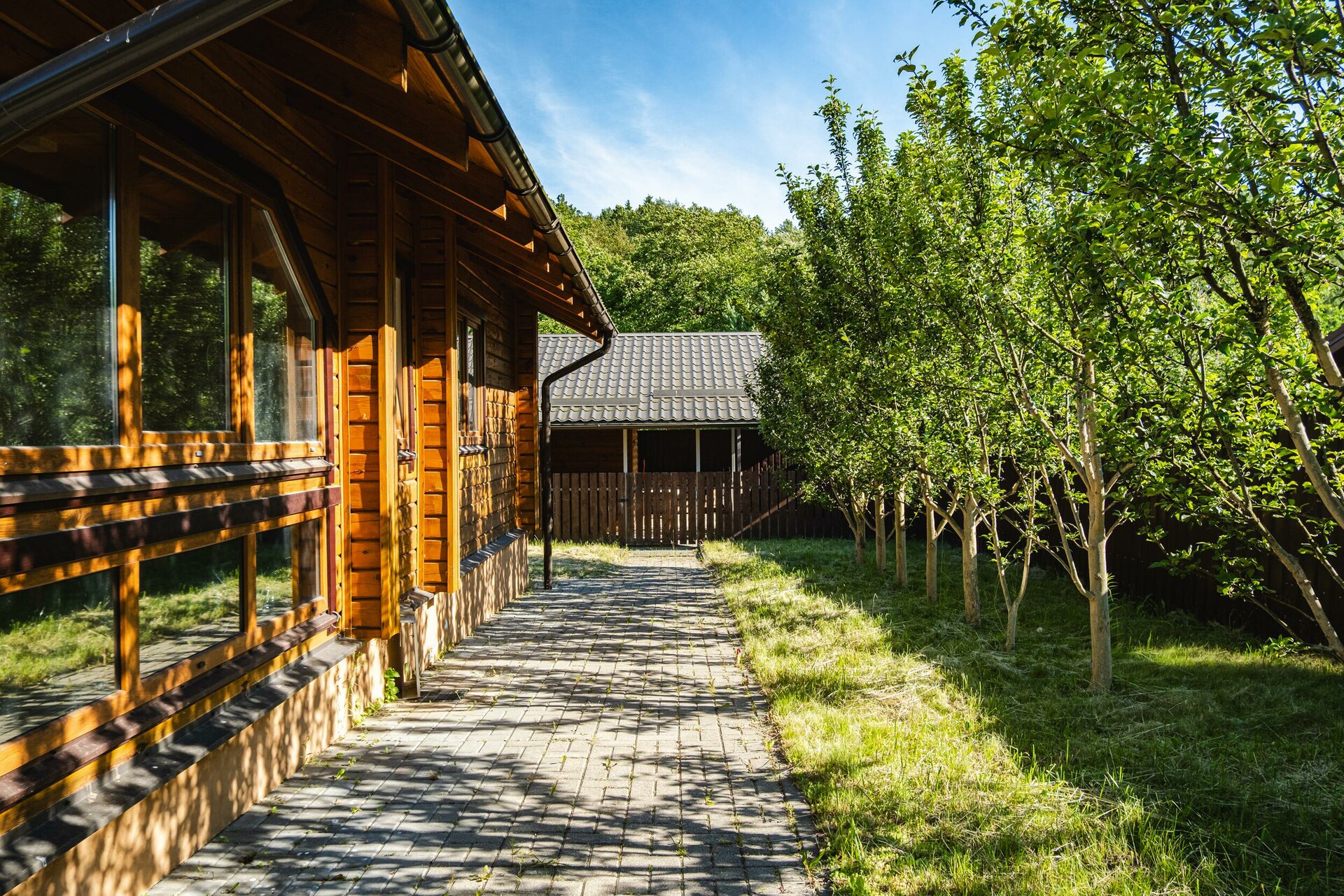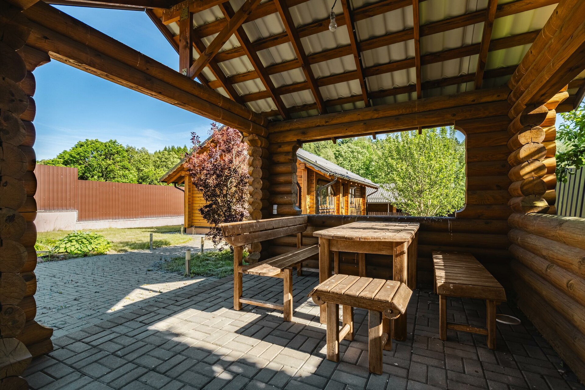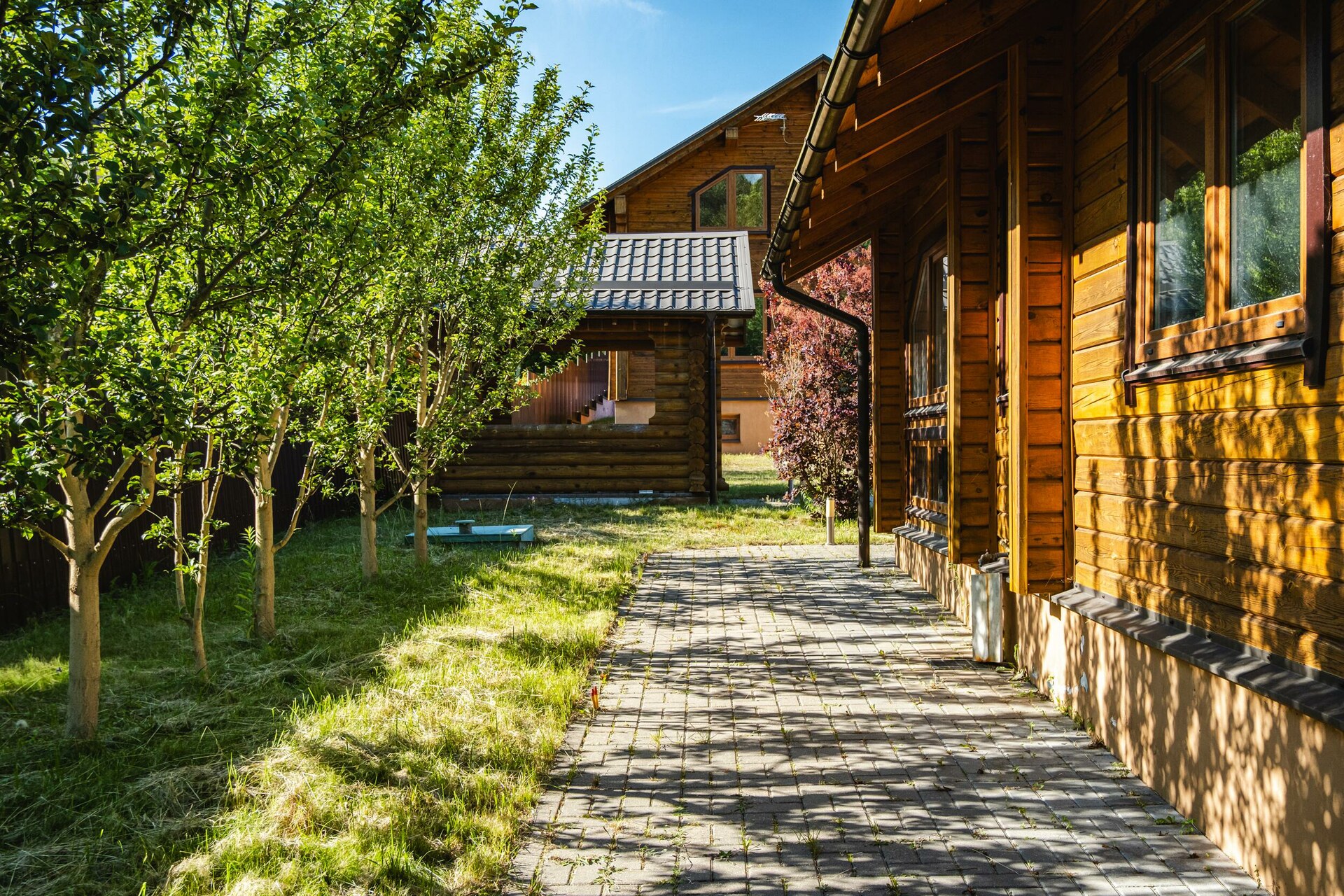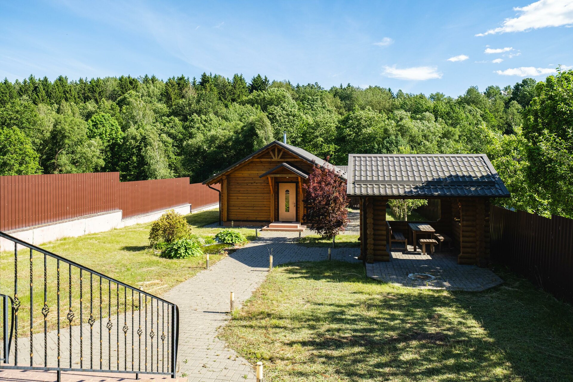 Мощение плиткой площадки перед домом. Парковочная площадка с навесом. Двухсекционные откатные ворота на электроприводе. Ливневый дренаж.