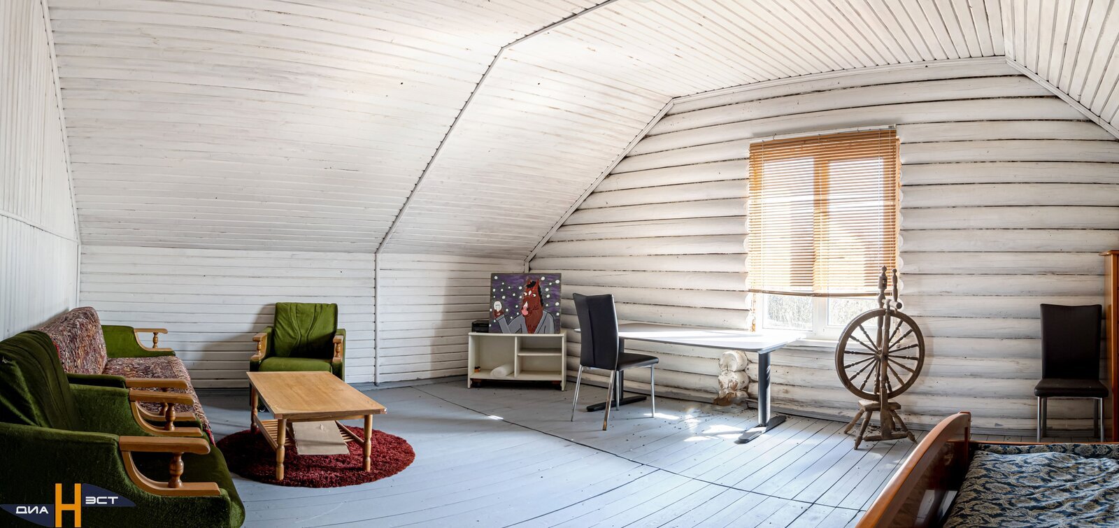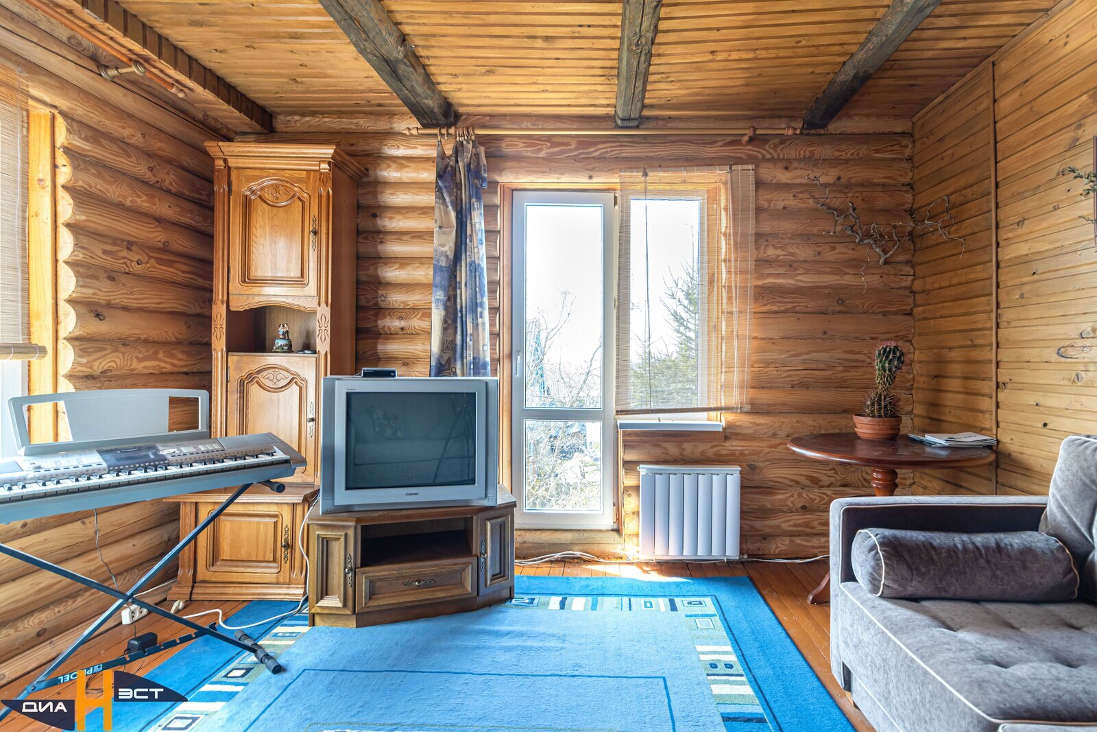 - Цокольный этаж выложен с использованием фундаментных блоков, первый и второй этажи сделаны из высококачественных оцилиндрованных бревен. Снаружи дом утеплён и оштукатурен;