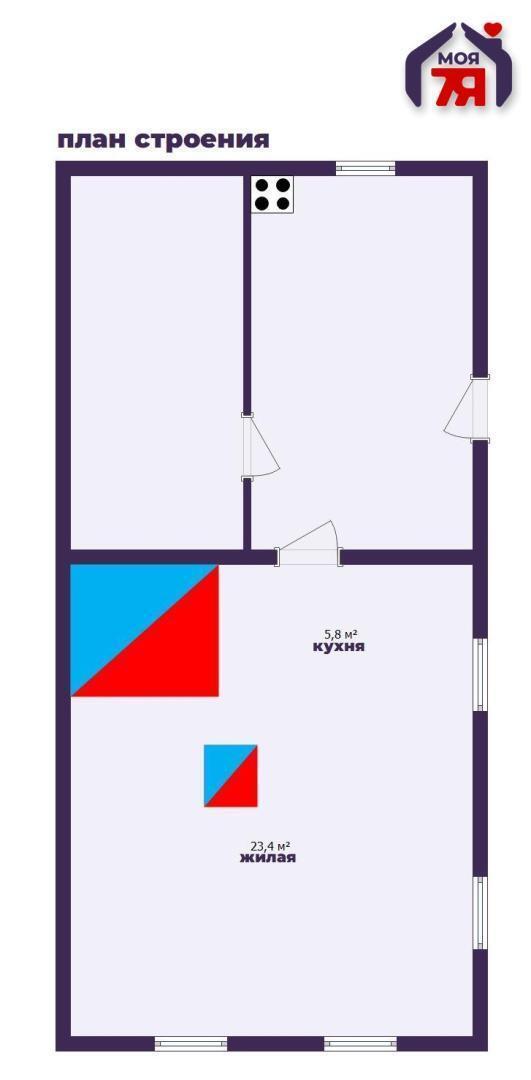 - Общая площадь дома составляет 47,2 м2, в доме имеется одна жилая комната 23,4 м2, кладовая и вместительная веранда.