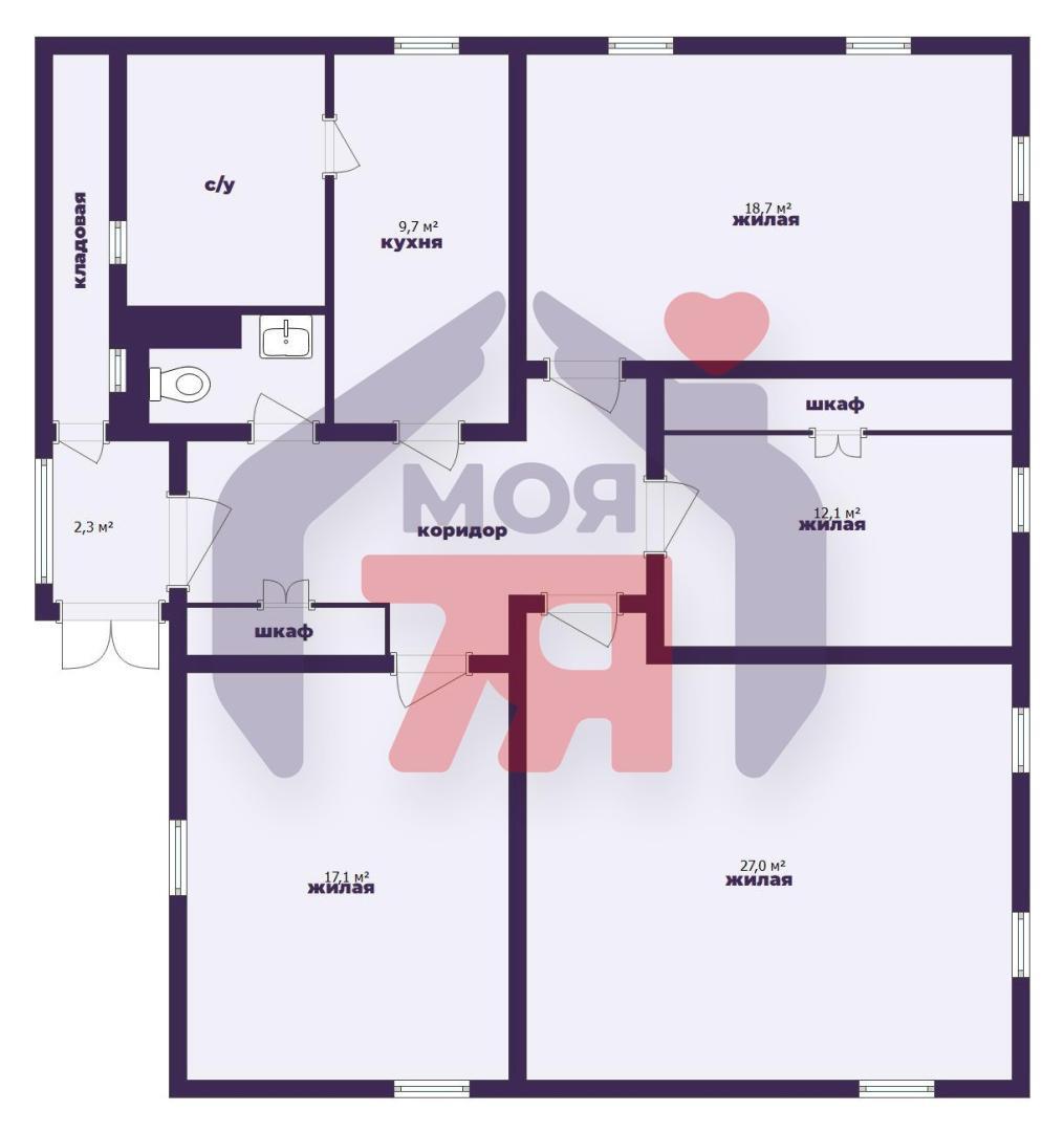- Продуманная планировка, выполнено грамотное зонирование. В доме 4 изолированные комнаты (27кв.м., 18,7 кв.м., 17,1 кв.м. и 12,1 кв.м.), комфортная кухня площадью 9,7м2 и вместительная кладовая.