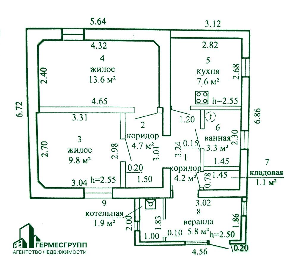 Общая пл. 52 м2, жилая – 23,4 м2, кухня - 7,6 м2, 2 жилые комнаты.