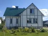 Дом полностью готов и сдан в эксплуатацию в 2021 году. Он размещён на земельном участке площадью 0.1945 (га). Участок находится в частной собственности. Крыша выполнена из металочерепицы. На первом этаже находятся прихожая, гостиная, кабинет, гостевая комната, кухня-столовая, санузел и топочная. Прихожая имеет плиточный пол, который имеет электрический подогрев с использованием автоматизации. Гостиная (также и остальные жилые комнаты) имеет пол из натуральной доски со специальной пропиткой и покрытием лаком. В гостиной находится камин. Кухня-столовая: пол деревянный и из керамогранита. Кухня имеет два окна, из нее есть второй выход на улицу. Оборудование: газовая варочная панель, электрический духовой шкаф, вытяжка, посудомоечная машина. В санузле первого этажа установлены полноразмерная ванна 170 см , раковина, инсталляция с подвесным унитазом. Имеется гигиенический душ. В санузле имеется полотенцесушитель, обогреваемый системой рециркуляции горячей воды. Пол в санузле с электрическим подогревом. Стены и пол отделаны керамогранитом.