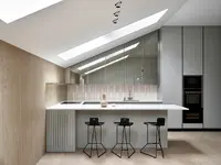 кухня индивидуального проекта с техникой NEFF, встроенными холодильником и морозильником LIEBHERR, итальянская плитка, керамическая столешница (Испания);