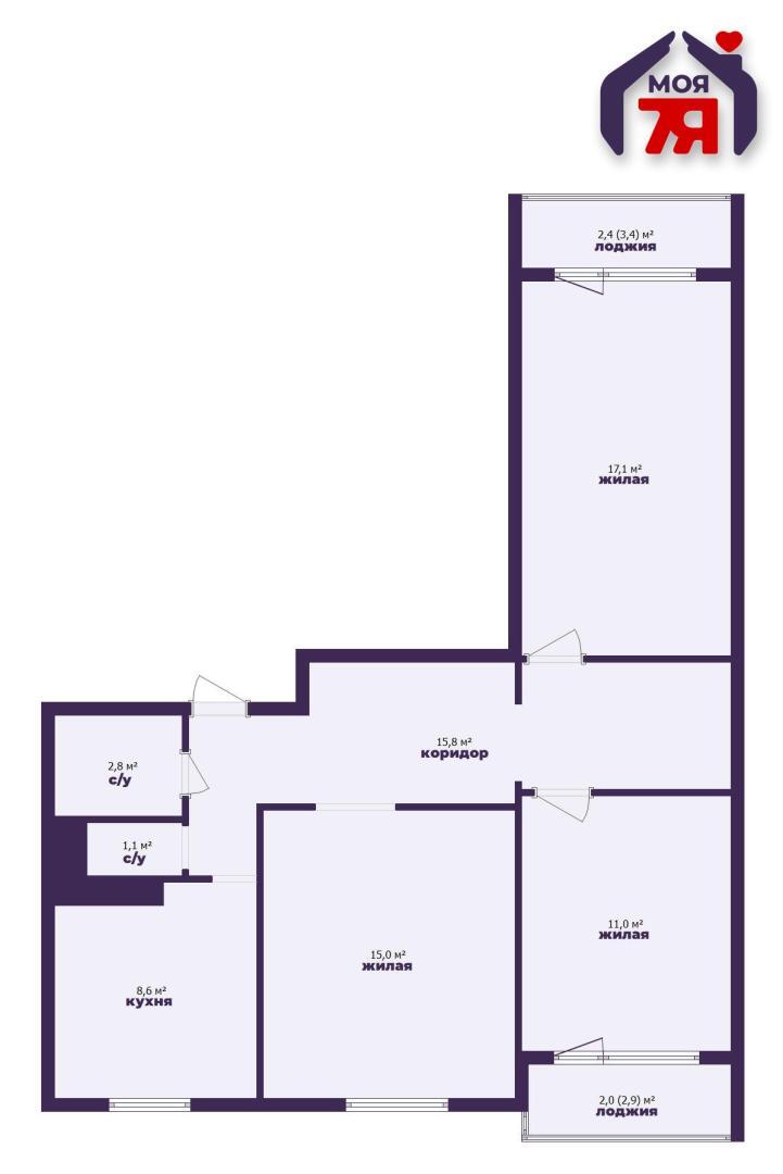 - Общая площадь помещения - 71,4 кв.м., жилая - 43,1 кв.м. представлена тремя изолированными комнатами, кухня -8,6 кв.м..