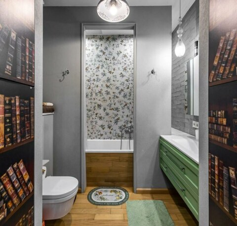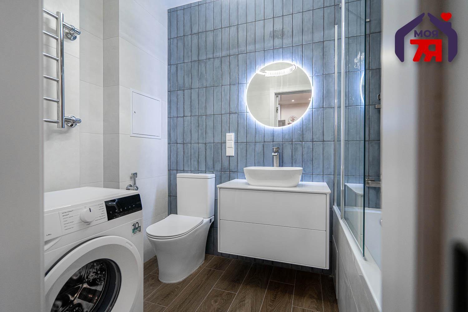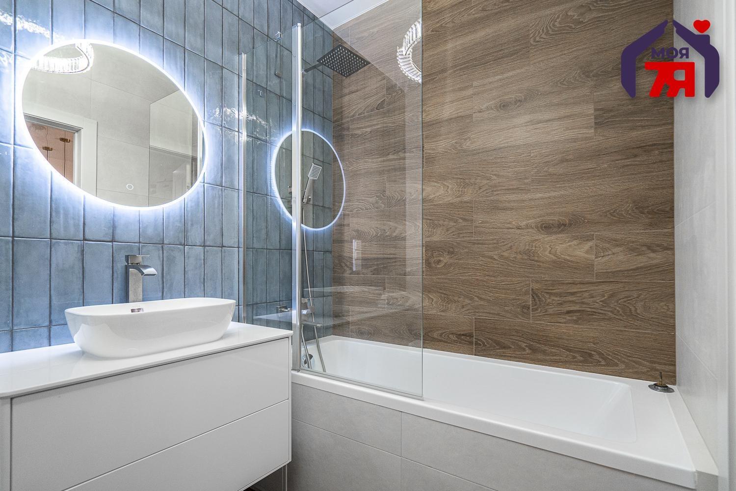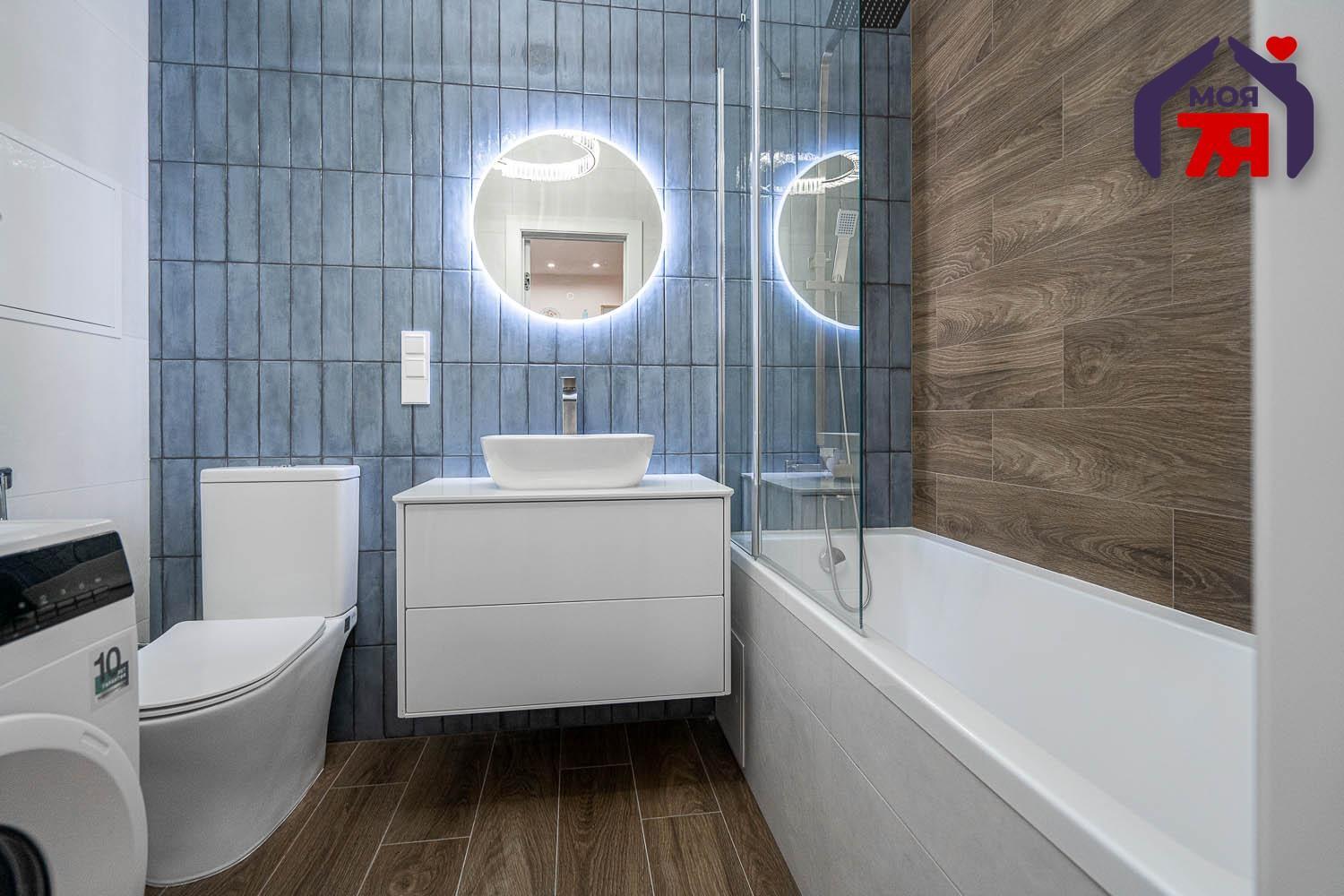 - Ванная комната выполнена в современных тонах: сочетание фактур дерева и небесно-голубой плитки создает ощущение спа-пространства. Здесь установлена качественная сантехника, удобная ванна, стильное зеркало с подсветкой и вместительная тумба. Все продумано для вашего комфорта.