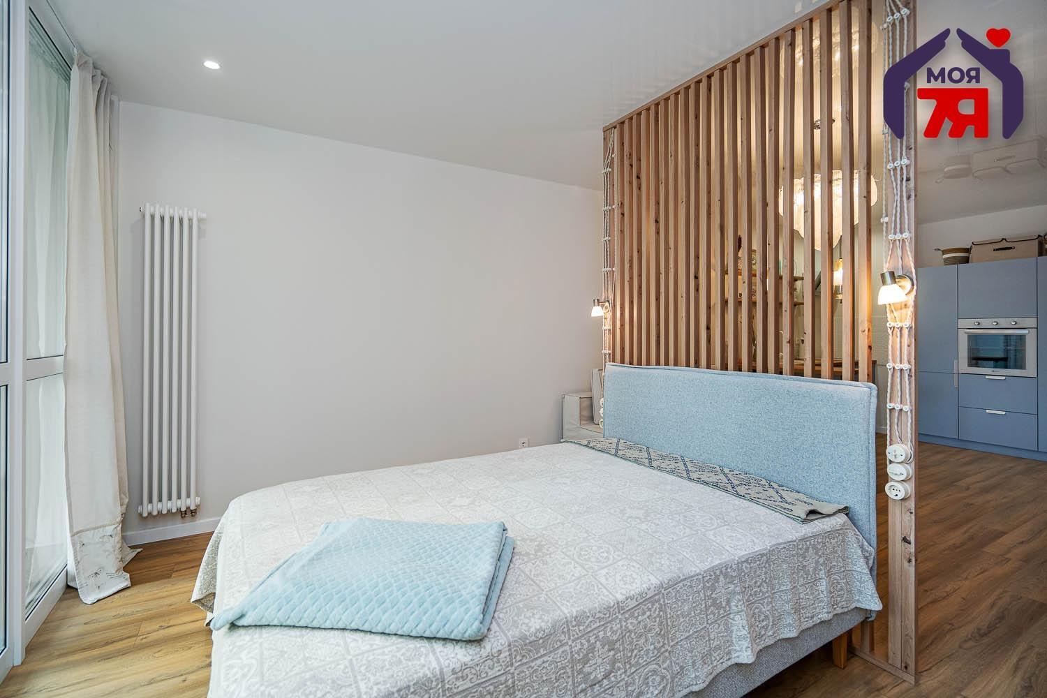 - Квартира выполнена в современном дизайнерском стиле - светлая, продуманная, с выразительной планировкой и четким разделением зон. Пространство включает гостиную, кухню и спальню, создавая ощущение легкости и воздуха. Зона спальни отделена стильной деревянной перегородкой, что придает приватности, но сохраняет ощущение открытого пространства.