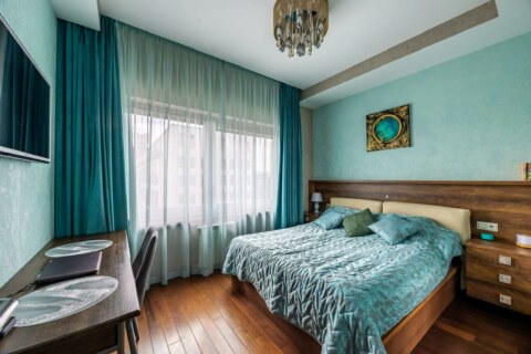 - Интерьер оформлен в спокойных тонах: стены окрашены в нежные цвета, а на полу уложен качественный ламинат, создающий уют и тепло. Натяжной потолок с современным освещением визуально расширяет пространство и делает квартиру особенно светлой.