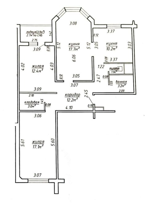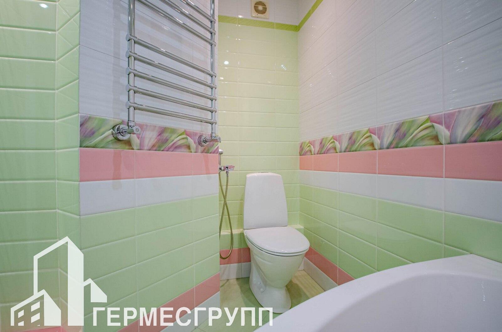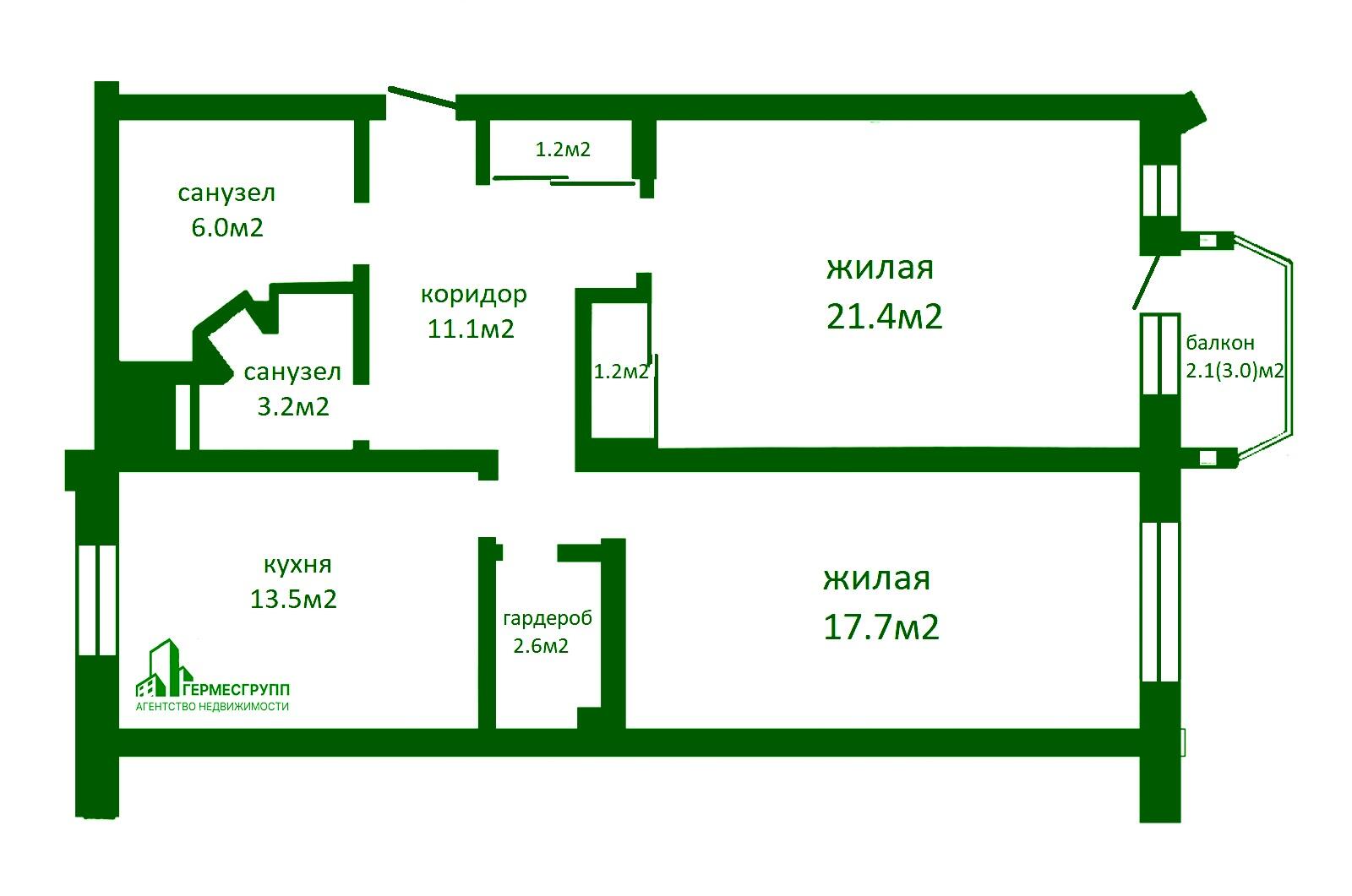Продуманная планировка (узаконена): две отдельные комнаты 17,7 м2 и 22,6 м2с выходом на балкон, гардеробная, просторная кухня – гостиная 13,5 м2 два санузла – 6 м2 с угловой ванной, умывальником и унитазом и 3,2 м2 с душем, умывальником, унитазом, стиральной машиной и бойлером. Окна на восток и запад. Квартира очень теплая и светлая.