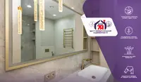 -Санузел оформлен в единой концепции с использованием крупноформатной плитки под мрамор. Подвесной унитаз, интегрированная раковина, акцентная фурнитура в тёплом металле и современное освещение создают интерьер уровня премиум. Зеркало с подсветкой и продуманная система хранения делают пространство не только эстетичным, но и удобным.