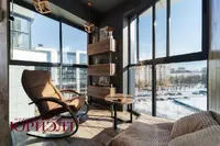 Лоджия выполнена под лаунж зону с кальянной, оборудована спальным местом, есть небольшой козырек на фасаде, который после 12 часов сдерживает активные лучи солнца.