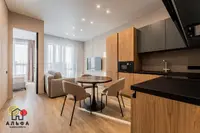 В продаже представлена видовая двухкомнатная квартира евроформата, расположенная в жилом комплексе Минск Мир, по адресу: улица Жореса Алферова, дом 7. Эта квартира находится на верхнем, 25-м этаже, что позволяет наслаждаться потрясающими видами и свежим воздухом. Площадь квартиры, согласно стандартам СНБ, составляет 40,8 квадратных метров, а еще и высокие трехметровые потолки, делают её достаточно просторной и уютной для комфортного проживания. Квартира находится в уникальном доме под названием «Манчестер», который расположен в квартале «Западная Европа». Этот дом стал символом современного стиля и комфорта, предлагая жителям все преимущества многофункционального комплекса Minsk World. Двухкомнатная квартира имеет продуманную планировку, включающую в себя спальню, кухню-гостиную, санузел и отдельную гардеробную, которая удобно расположена в спальне. Это идеальное решение для семейной пары или молодой семьи, которая ценит комфорт и уют. Одним из главных преимуществ данной квартиры является то, что вам не придется тратить время и усилия на ремонт. Она продается с уже выполненной дизайнерской отделкой из высококачественных материалов. В отделке использованы натуральные древесные элементы, которые присутствуют как в кухне, так и в предметах интерьера, мебели. Все двери в квартире имеют скрытый монтаж и оснащены итальянской фурнитурой, что добавляет дополнительный шарм и элегантность. Гостиная комната совмещена с кухонной зоной.  Кухня выполнена из натуральных материалов и оборудована встроенной техникой, включая холодильник, индукционную варочную поверхность, духовой шкаф, вытяжку, посудомоечную машину и микроволновую печь. В зоне гостиной установлен большой телевизор, а также удобно расположился раскладной диван, что позволяет создать комфортное место для отдыха и развлечений. Освещение в кухне-гостиной организовано с учетом различных сценариев, что позволяет создавать уютную атмосферу в любое время суток. Спальня оформлена в спокойных, нейтральных тонах, что создает расслабляющую обстановку для отдыха. Вход в вместительную гардеробную находится именно в спальне, что очень удобно. Гардеробная, оснащенная системой хранения, помогает оптимально использовать пространство и освобождает больше места для жизни. Санузел в квартире совмещенный и включает в себя все необходимое.